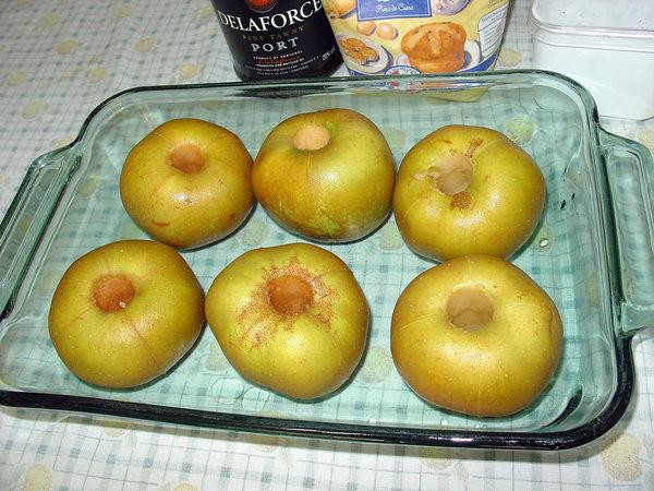 Começamos por lavar muito bem as maçãs. Depois descaroçamos as maçãs, vamos guardar os caroços para a calda, e fazemos uns cortes ligeiros na casca (para a maçã não rebentar). Em seguida colocamos as maçãs num pirex, dividimos um dos paus de canela em vários bocadinhos e colocamos dentro do orifício de cada maçã e colocamos o outro pau de canela e os caroços das maçãs dentro do pirex. Depois enchemos o orifício das maçãs com açúcar, regamos as maçãs com vinho do porto e voltamos a colocar um bocadinho de açúcar no rebordo do orifício. Se ainda não estiver vinho do porto suficiente no fundo, colocamos mais um pouco. E vai ao forno cerca de 20 minutos a 180º.