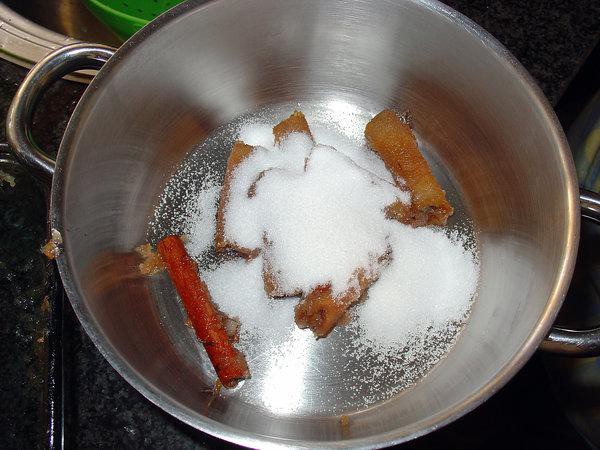 Se o vinho do porto tiver evaporado (quase) todo, vamos ter que fazer uma calda. Para isso colocamos numa panela os caroços das maçãs, o pau de canela, açúcar e água e deixa-se ferver até ter um molho grosso.