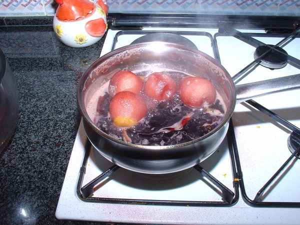 Começamos por cortar uma casquinha (fininha) de limão se ainda não estiver. Em seguida lavamos as pêras e descascamos, mas vamos deixar um pouco da parte de cima da casca. Numa panela metemos o açúcar, o pau de canela, os cravinhos, o vinho do porto e mexemos. Agora colocam-se as pêras na panela e colocamos vinho tinto até cobrir as pêras até à zona com casca, por fim coloca-se um bocado do conhaque. Leva-se agora ao lume cerca de 40 minutos.