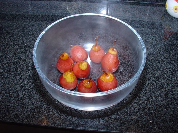 Passados os 40 minutos verificamos se as pêras estão cozidas espetando-as com um palito, quando estiverem colocamos-as num recipiente juntamente com o pau de canela, e deixamos a calda a ferver mais uns minutos para engrossar mais um pouco. Por fim juntamos a calda às pêras e deixamos arrefecer. Se preferires, quando estiverem frias colocas no frigorífico.